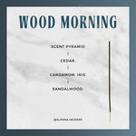 Wood Morning: A grounding blend inspired by coastal fall mornings, combining cedar, cardamom, and sandalwood.